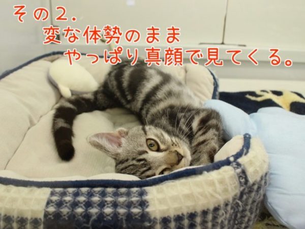 変な体勢でも真顔は健在。