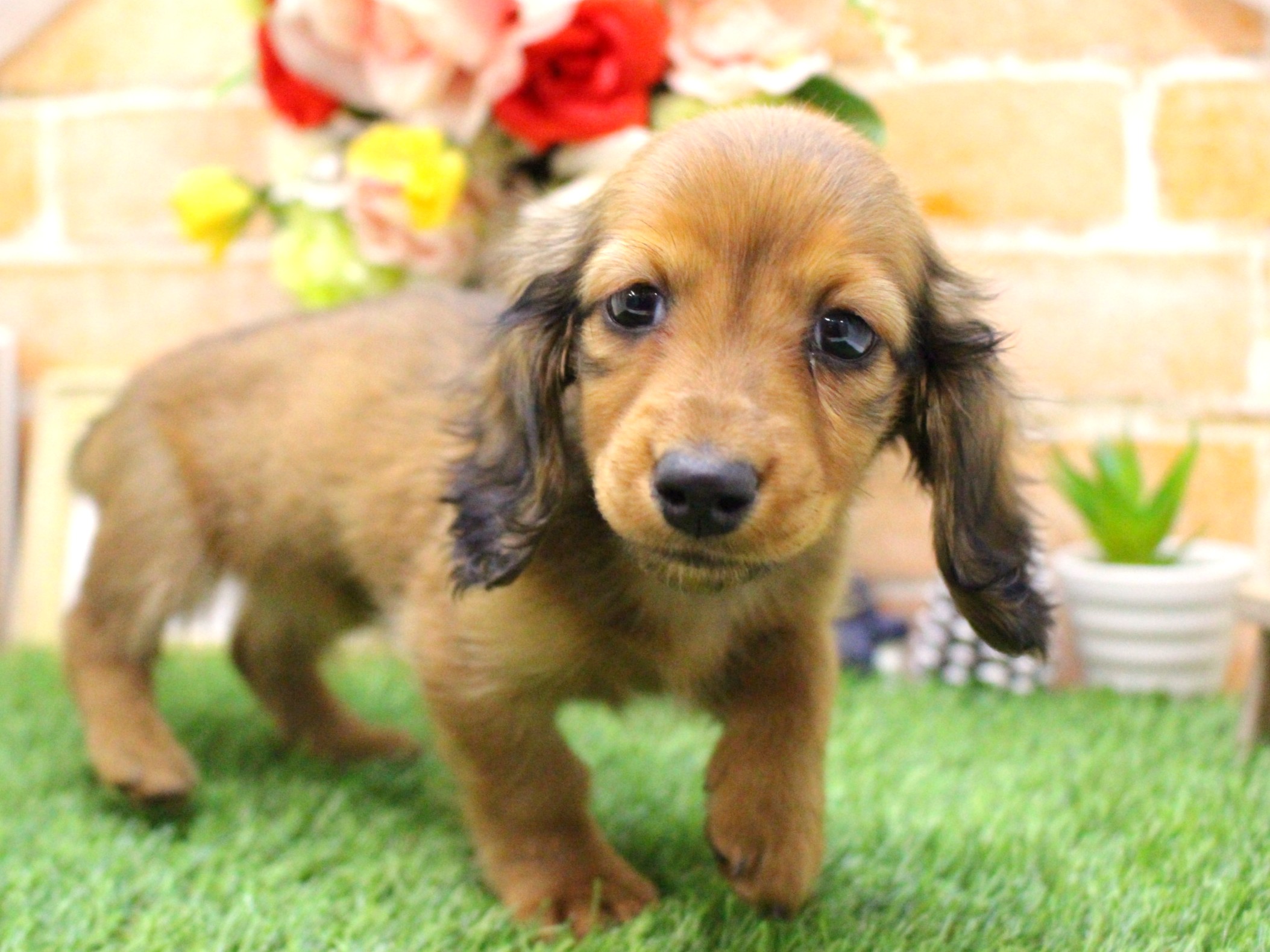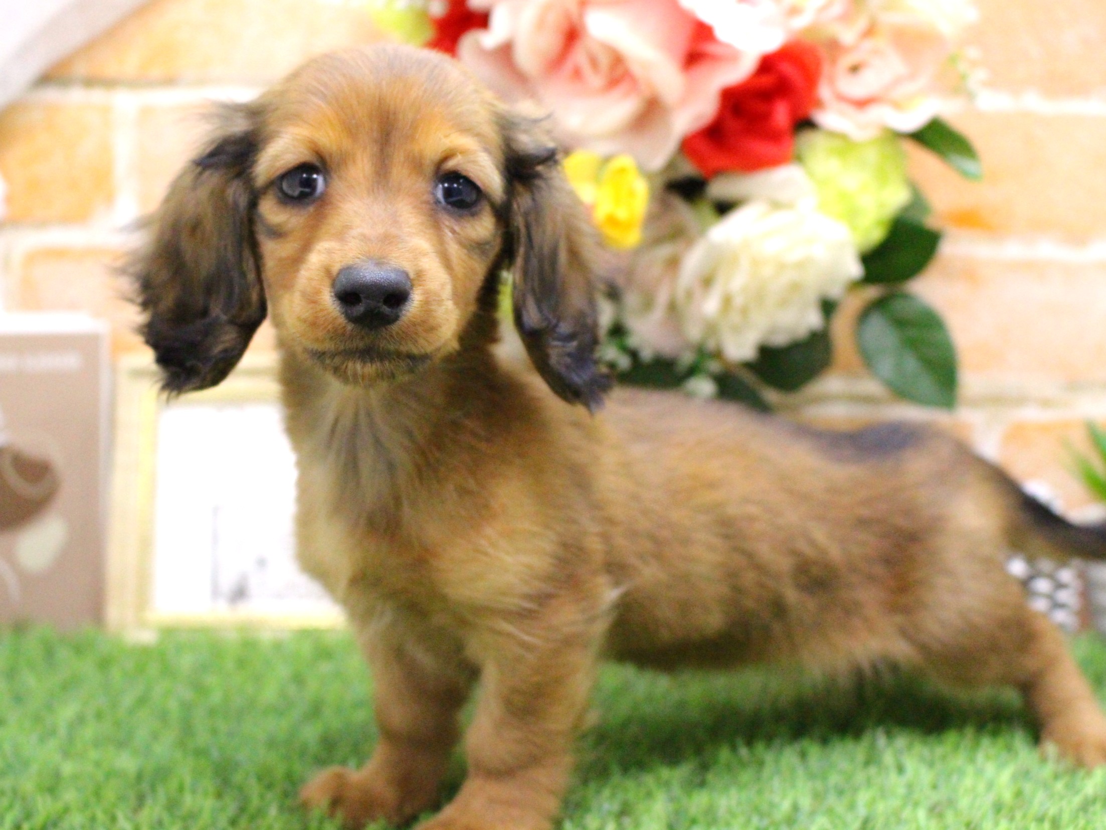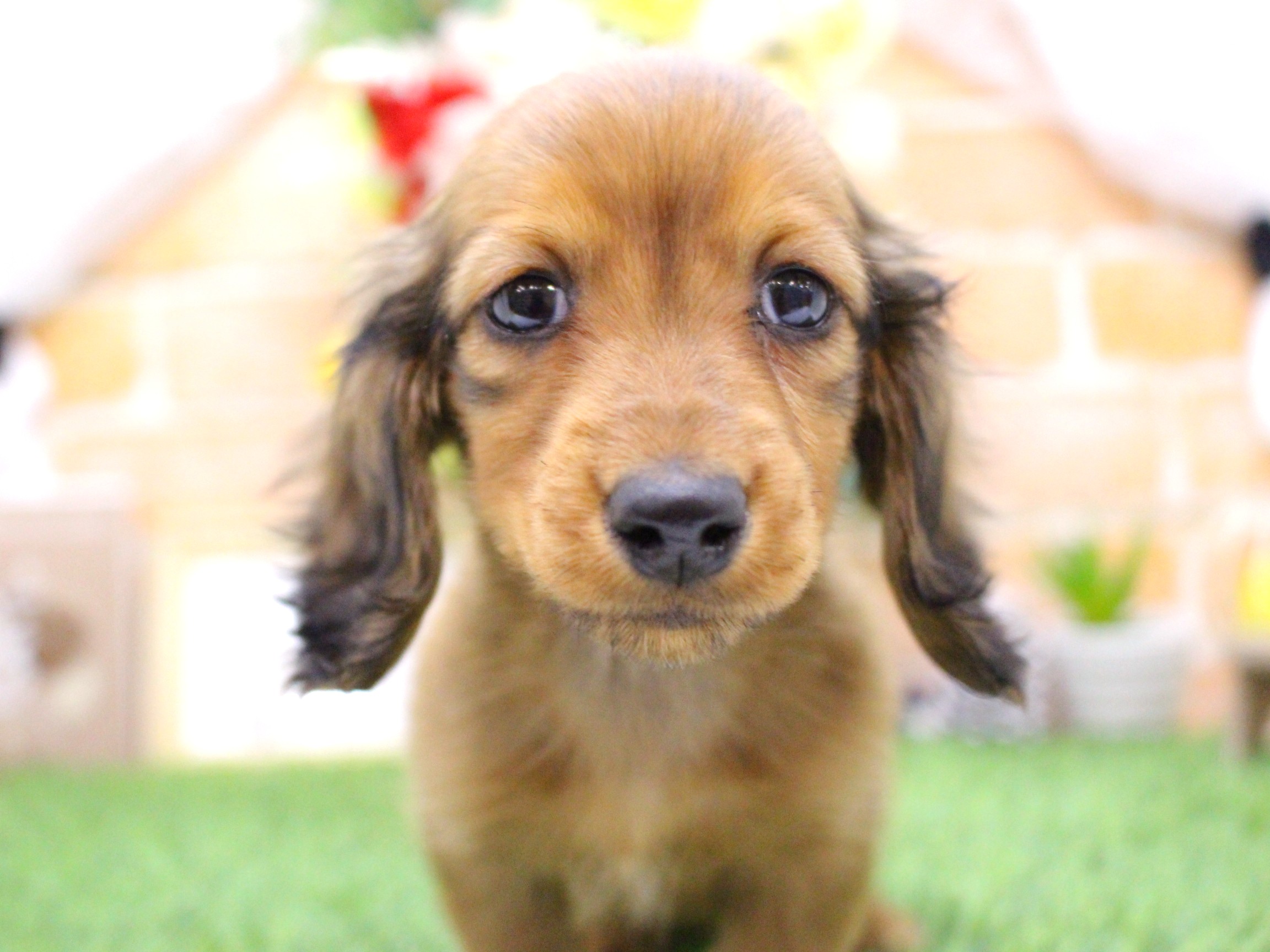 女の子らしいたれ目の美人さんが魚住店に仲間入りしました。“ダックスは活発でよく動き、走りまわる”イメージですが、この子はとってもマイペースでのんびりやさんです。“人の気配を感じるととにかくアピール!!”する子がほとんどなんですが…この子はワンテンポ遅れます。スタッフが手を入れてもしばらくじ~っとしていて、遊んでくれる(かも…)と気付くとゆっくりと近寄ってきます。人は大好きなようで、なでてあげるとしっぽを一生懸命振って“うれしい!!”をアピールしてくれるところがこの子のチャームポイントです。